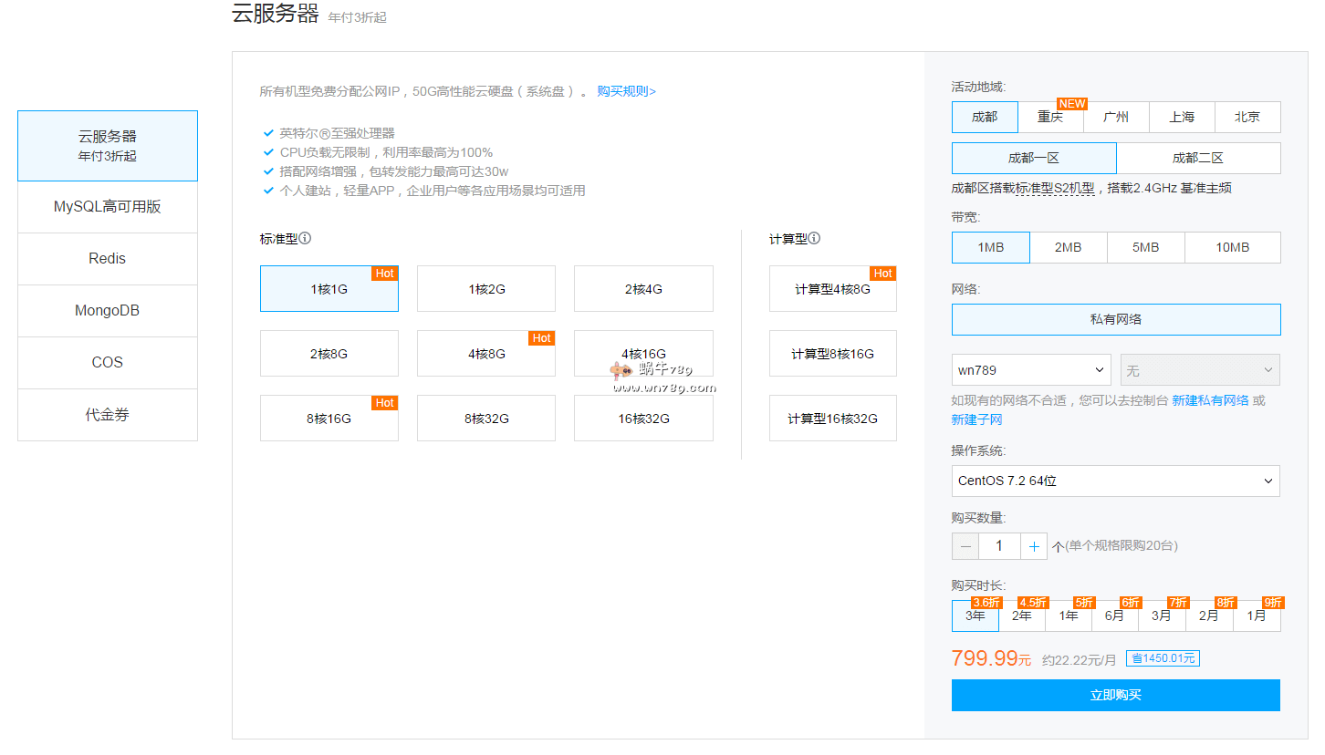 此次活动可选云服务器配置众多,站长在这里也不好一一列举了,直接上一个图来的更为直观,最低配置1核1G内存、50G硬盘、1Mbps带宽,三年只需799.99元,平均下来年付只需266元。一般的个人博客推荐1核2G内存、2核4G内存配置,至于带宽方面根据自己需要选择,个人觉得1Mbps够用,如果流量较大可以选择2Mbps、5Mbps。