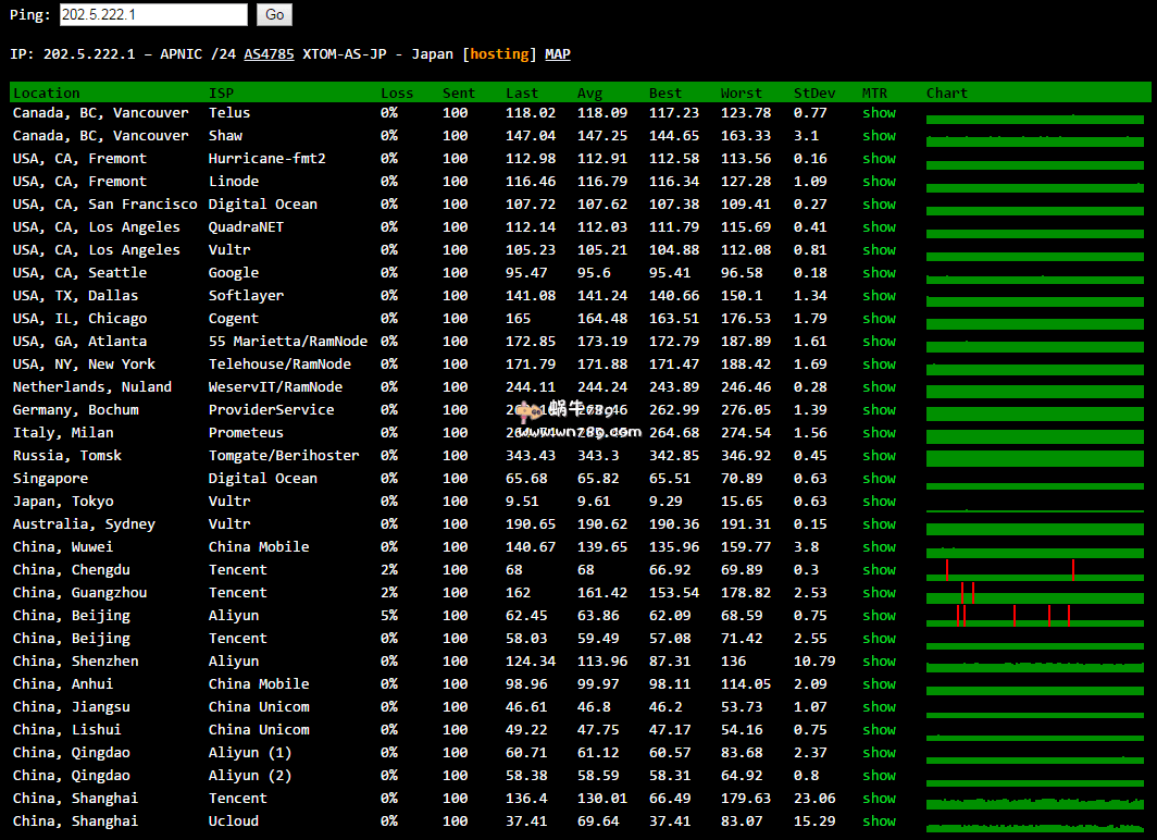 | 13 | 202.5.222.1 | 202.5.222.1.reverse.os1.vh.net | 日本大阪府大阪 xtom.com | AS4785 | 48.4 / 173.7 / 47.6 |