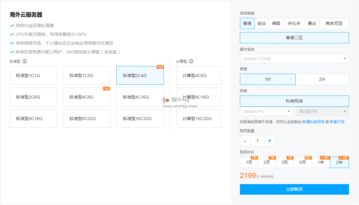 腾讯云此次促销的海外云服务器均采用英特尔@至强处理器,CPU负载无限制,利用率最高为100%,适合个人建站及企业级应用场景,所有机型免费分配公网IP,50G高性能云硬盘(系统盘)。可选配置众多,从1核1G内存到16核32G内存一共12个配置可以选择。下面列举了三款适合建站方案,推荐选择香港节点2核4G内存2Mbps带宽配置,一次性购买2年。