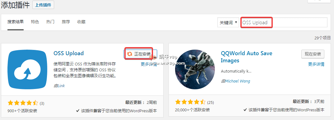 OSS Upload是有由国内一位大佬@XiaoMac在2016年开发的,插件也一直都在更新。安装方式有两种,一是直接在WordPress后台插件管理页面搜“OSS Upload”并安装即可。