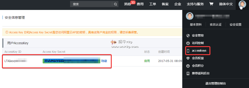 1、设置插件之前,我们首先要开通阿里云对象存储OSS(关于阿里云对象存储OSS的开通及使用教程可以参照此文章【阿里云对象存储OSS】0元购价值121元的100G每年的外链储存包)及获取到“用户AccessKey”的AccessKey ID和Access Key Secret信息,关于如何获取可以参照下面图片。