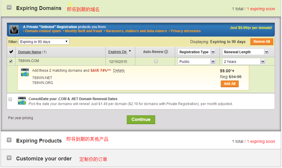 点击“Continue”后,会提示你是否续费其他产品,如果你需要请按照域名续费操作勾选相关内容,如果不需要续费其他产品,请直接点击“Continue”继续。
