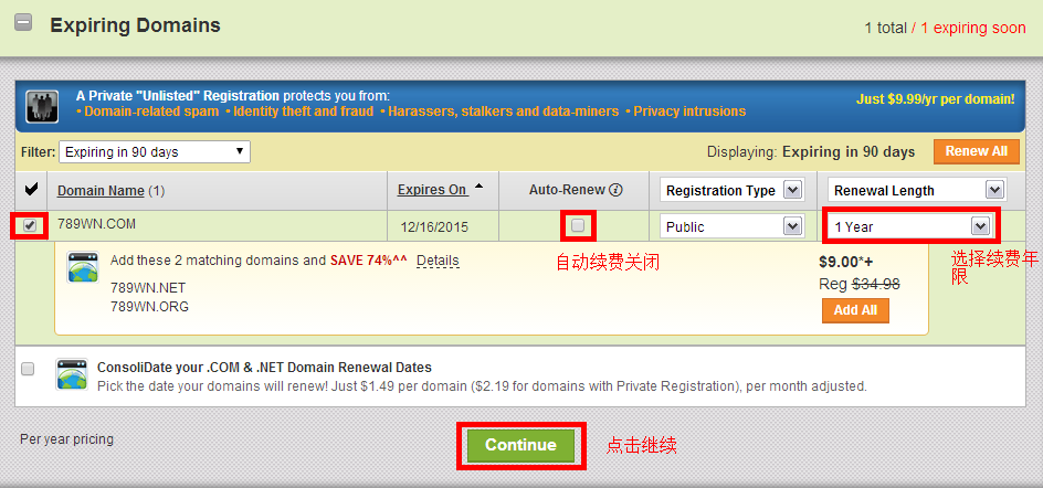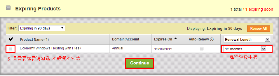 4、站长这里以续费域名为例,首先需要勾选续费的域名,然后选择续费年限,再点击“Continue”继续。