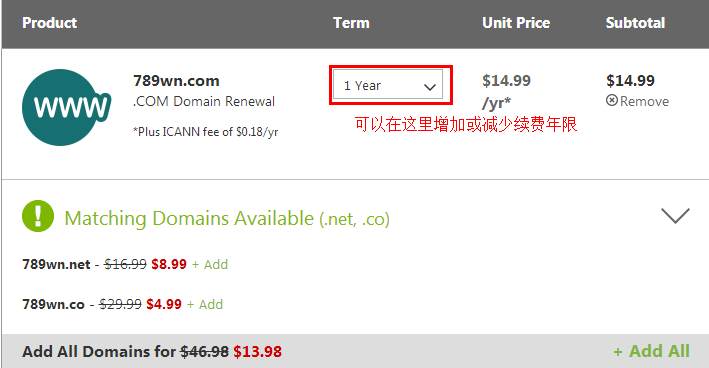 5、选择完续费产品后,进入到购物车.我们可以继续选择续费年限。