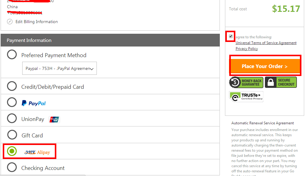 8、选择付款方式及勾选接受服务条款,然后点击“Place your Order”。关于付款方式,你可以根据自己需要选择,如果你有PayPal,也可选择PayPal付款。