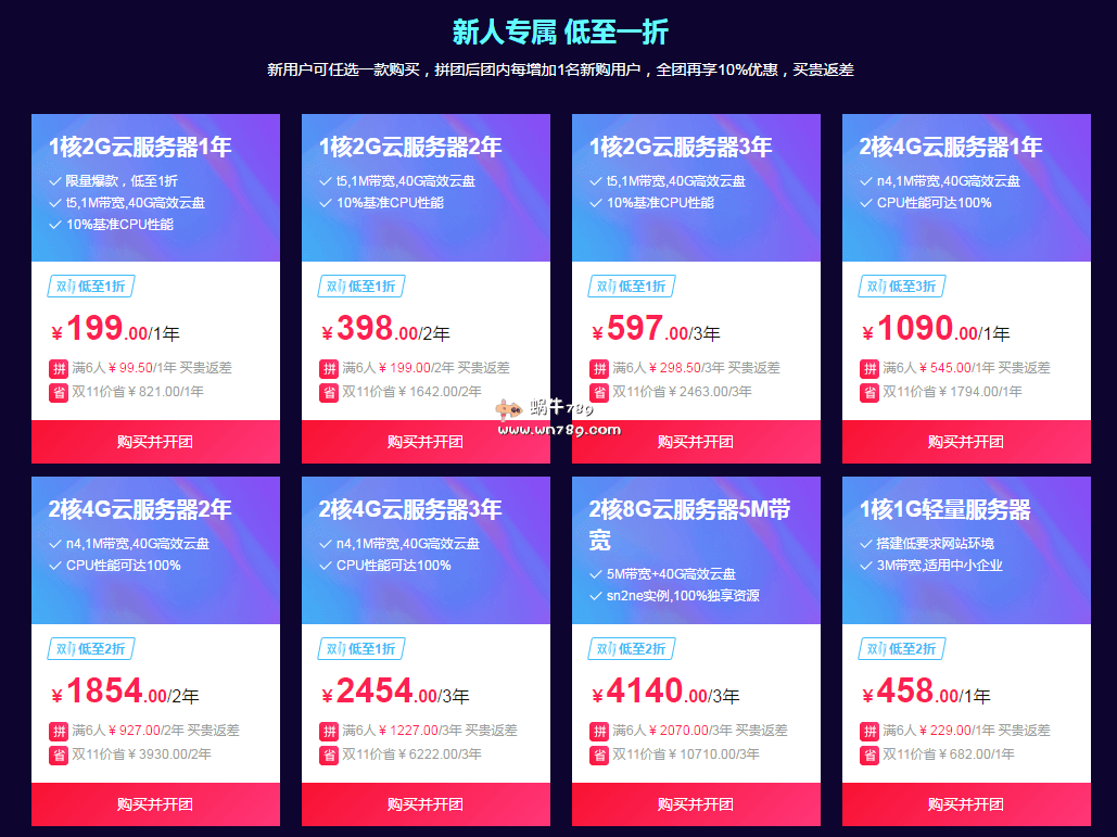 腾讯云从10月17日-10月26日爆款秒杀活动结束后,相信有些没有及时买到实惠服务器的朋友多少会有点后悔,不过不要紧,双11临近国内主流云计算商家基本都会发布相对给力的促销活动。这不,阿里云今天发布了今年双十一促销活动,主打云服务器、云数据库、CDN等产品,其中云服务器产品相比之前的促销,还是稍微有点看头的,以拼团的形式可以将价格降低至一折,站长大略看了下促销云服务器方案,有1核2G内存1Mbps带宽的T5突发型实例(10%基准CPU性能)、2核4G内存1Mbps带宽的N4共享计算型实例(CPU性能可达100%)、2核8G内存5Mbps带宽的sn2ne通用网络增强型实例(100%独享资源)、1核1G内存3Mbps峰值的轻量服务器。