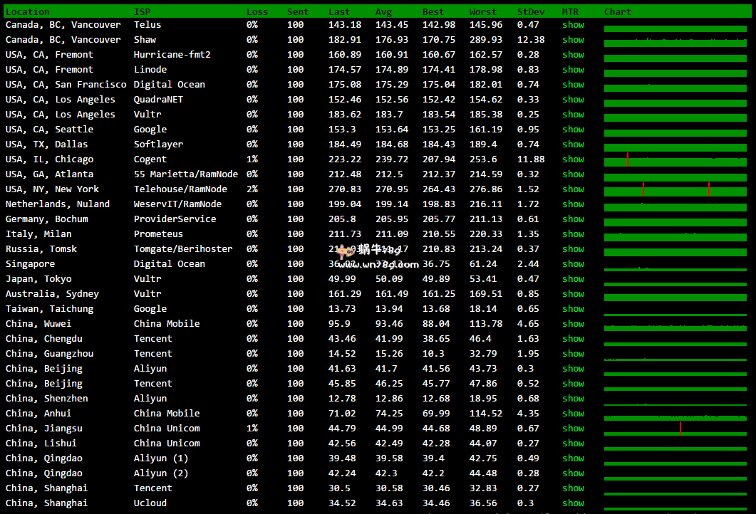 8、全球节点抖动及丢包测试。