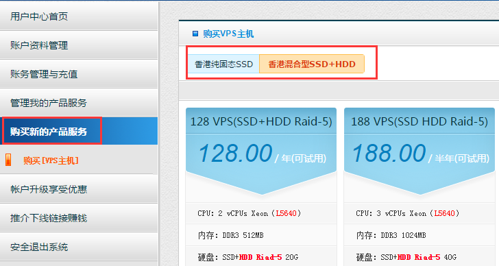 下面列举了香港纯固态SSD、香港混合型SSD+HDD部分小内存方案,如果需要跟高配置的可以自己到官网选购。关于如何选购产品请点击下面地址到官网,注册账号后在客户管理页面进行VPS选购。另外所有方案支持免费试用,试用时长为2小时。