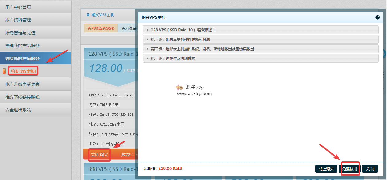Topmain所有VPS产品都支持免费试用2个销售,那么如何申请试用?先点击直达官网注册一个账号,然后登录客户管理页面,如下图操作即可免费试用所有VPS产品。