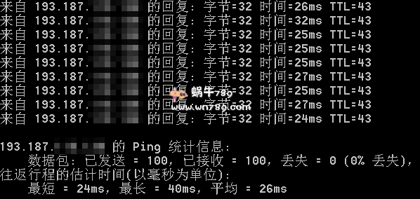 5、本地ping丢包次数测试。站长本地是电信带宽;100次发包、0次丢包;平均延迟在26毫秒;最短24毫秒、最长40毫秒,比较稳定了。
