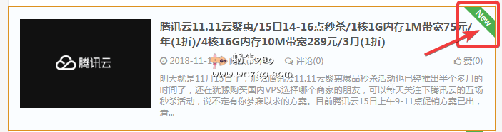 主机玖玖目前使用的是大前端DUX主题,在2018年11月6日正式购入了正版主题并启用(庆祝下!主机玖玖正式启用DUX正版主题/之前使用的DUX无限制版可联系站长获取/100%直接从服务器下载/绿色安全)。由于自己使用的事DUX主题,所以对此主题的小修改、美化方面的内容关注的比较多,如果有兴趣可以关注下本博客关于WordPress的文章(点击这里查看)。之前站长在WordPress美化小技巧 为新文章标题及内容页面添加NEW图标文章当中介绍过如何为24小时内发布的文章添加“NEW”图标,今天在此文章中再为大家介绍一个通过修改“main.css”文件来实现把“NEW”图标显示在文章的右上角,如下图,结合本博客的首页顶置图标(如果你用的是DUX 4.0以下版本,可以看看此文章DUX主题添加首页显示顶置文章功能 支持只显示指定顶置分类文章),显得更加美观、统一。整体效果可以查看主机玖玖首页。