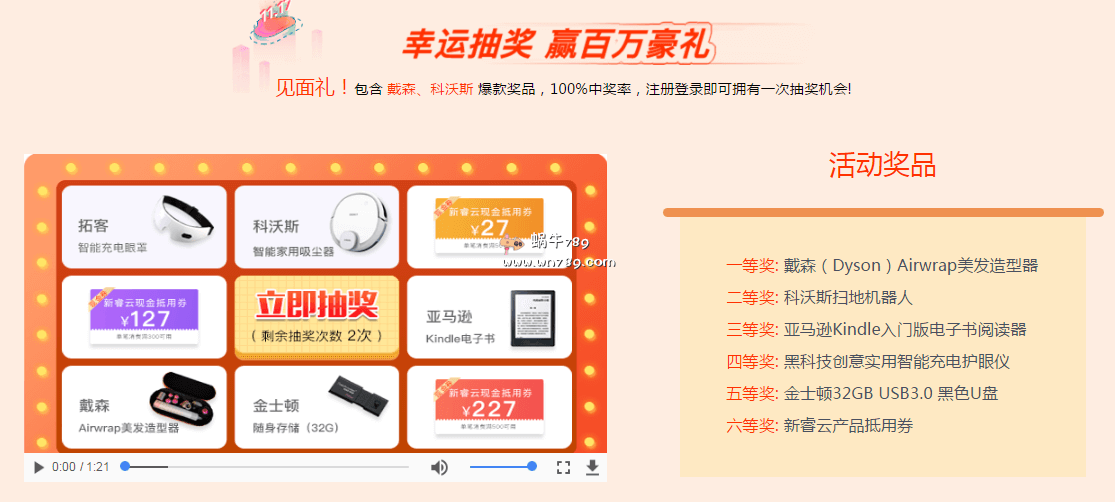新睿云是来自国内的IDC商家,品牌创建于2017年,隶属于北京允睿讯通科技有限公司,企业运作,实力雄厚,拥有自营IDC。今天上午商家工作人员发来了最新的“周年庆典”促销活动,主打云服务器、对象存储、云数据库、GPU服务器产品,限时1.7折秒杀,每台云服务器赠送1个VPC、1个公网IP、1个防火*、免费V屁N、负载均衡、云网关服务,零利润回报新老用户;更有免费抽奖(保证每次都100%中奖!戴森美发造型器、科沃斯扫地机器人等实物奖品!注册完成认证即可获得一次抽奖机)、云服务器0元体验一年等活动。活动时间为2018年11月17日-2018年12月17日,为期一个月的时间,新老用户均可参与。