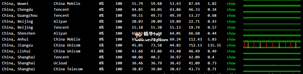 4、电信、联通、移动三网丢包及抖动测试。下面是测试结果,出了江苏联通有丢包及不太稳定外,其他节点相当稳定,也无任何丢包现象。江苏联通应该是线路问题,并非机房原因。