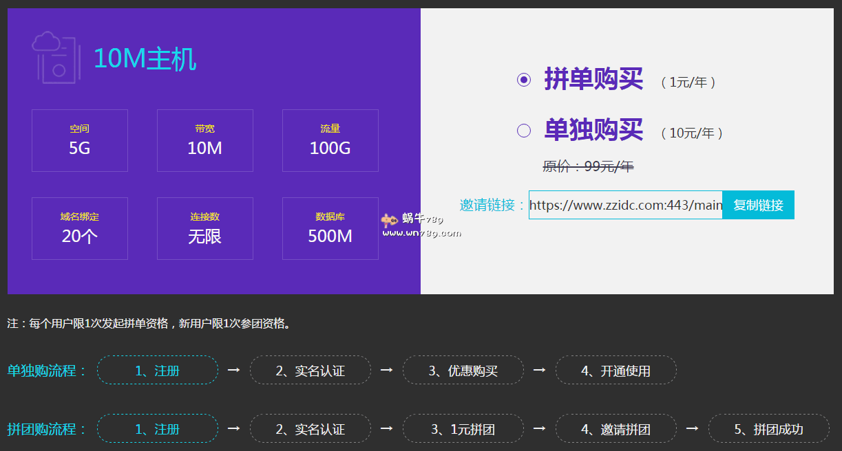 景安网络是来自国内的IDC商家,大企业,产品比较靠谱,刚才收到商家发来的最新促销活动投稿,此次活动主打新用户群体,国内数据中心的独享虚拟主机原价99元/年的方案,现在新用户专享,拼团仅需1元,独购也只需10元,配置为:5G空间、100G流量、10M独享带宽、500M数据库、1个独立IP、20个域名、无限连接数,性价比不错,独享虚拟主机机房为景安郑州自建机房,BGP多线骨干网接入。如果是建站使用,需要注意的是域名必须有稳定,而且稳定须接入景安网络。此次新用户专享的独享虚拟主机支持稳定,不过消费必须满10元以上,也就是拼团1元购买的用户还需要消费9元才能通过景安网络进行免费稳定,如果是10元购买的可以直接享受免费稳定了。