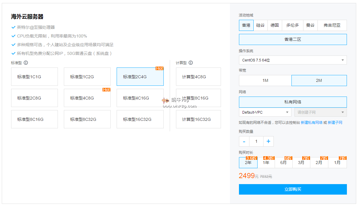 云服务器产品采用英特尔至强处理器、CPU负载无限制、利用率最高为100%;个人建站及企业级应用场景均可满足;所有机型免费分配公网IP、50G普通云盘(系统盘)。下面站长列举了两个四折以下的促销方案:1核1G、1核2G内存、2核4G内存方案,其他促销方案均在五折以上就没有列举出来了。其实下面列举的方案如果是建站使用,一般的个人博客完全可以满足的。至于如何选择配置,站长建议配置是2核4G内存、2Mbps带宽,应为折扣是3.6折,是2M带宽的方案当中折扣最大的。如果选择1Mbps带宽,那么就选择1核1G内存方案,因为折扣是3.1折,1M带宽里促销力度最大的。当然还是需要综合自己需要对配置进行选择,个人建议是1核2G或2核4G配置。
