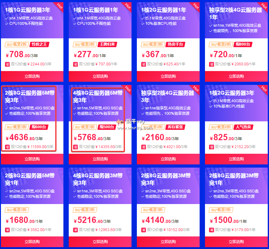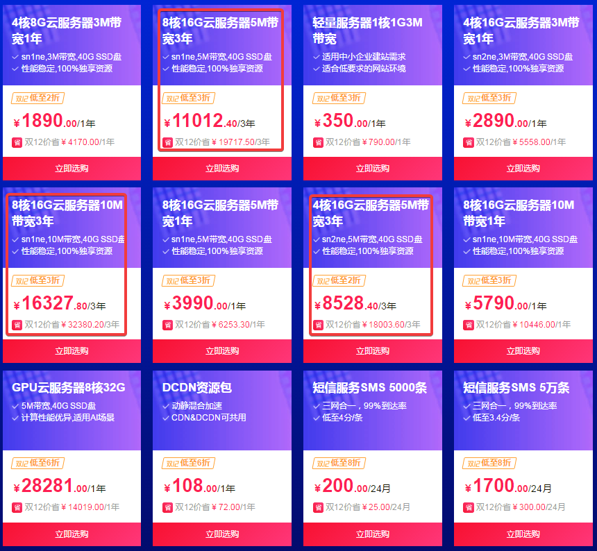 下面是阿里云最新的双12促销方案,站长把5Mbps带宽而且可以购买三年的促销方案进行红框标注,大家可以重点考虑。如果是建站使用推荐在两款2折方案内挑选:一般的个人博客、网站可选择100%独享资源的独享型2核4G云服务器,3年只需2160元。另外还有一款两折的大内存方案4核16G内存5M带宽云服务器,3年元8582元。