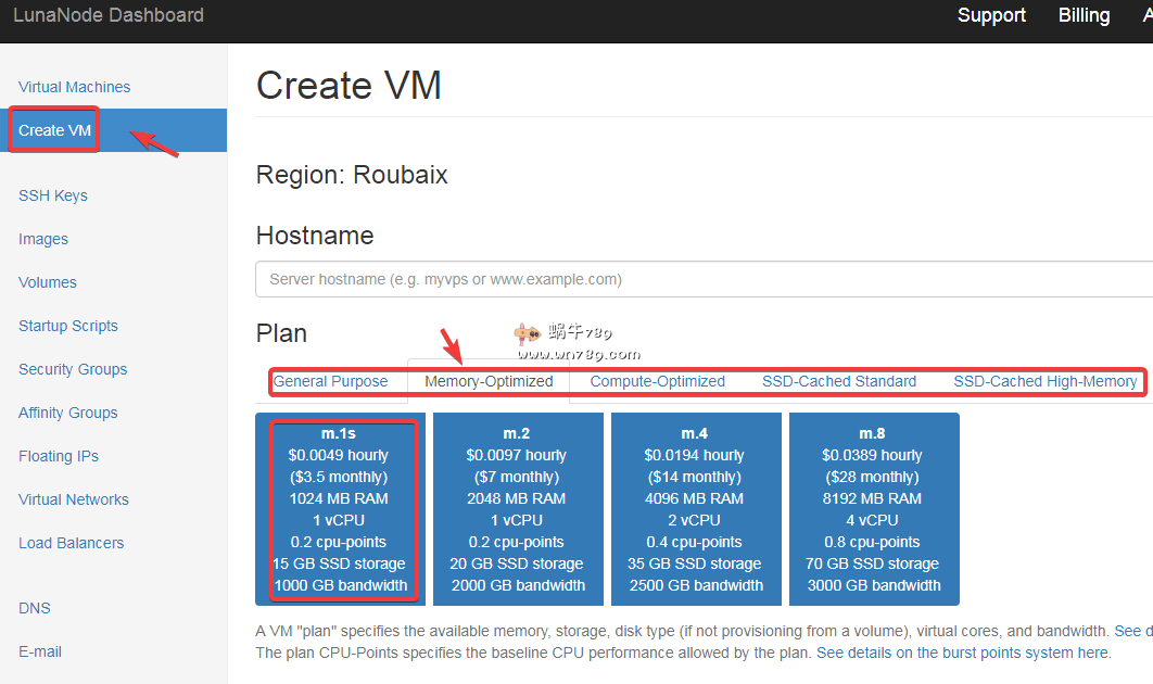 如何购买LunaNode的VPS产品?点击上面的购买链接注册一个账号并登陆后台,如下图点击“Create VM”,然后选择对应机房,在如下图选择“Memory-Optimized”就能找到3.5美元/月的方案了。