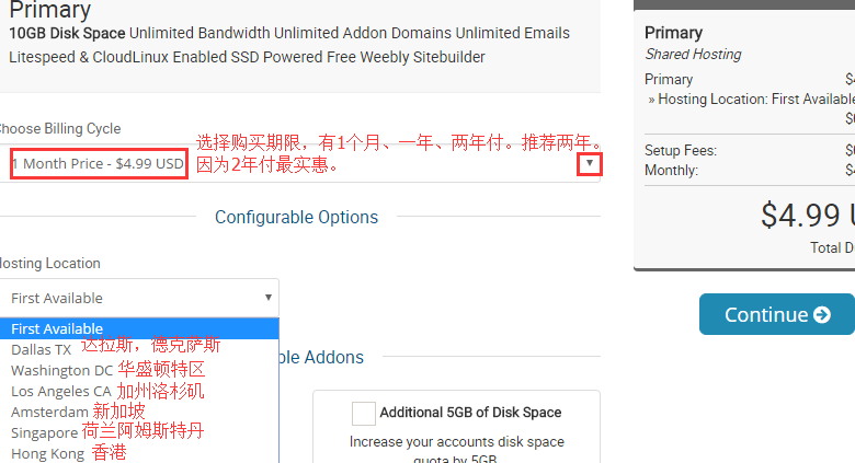 4、选择购买年限和主机服务器地区,如果免费国内用户,建议使用加州洛杉矶和新加坡地区,因为这两处服务器是相当距离中国较近的,访问速度会更快些。选择好年限和主机地区之后,点击”Continue“继续下一步。