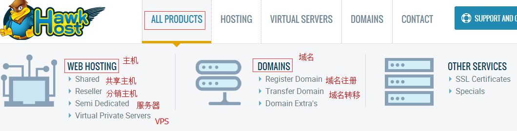 1、打开官网地址。鼠标移动到”ALL PRODUCTS“。我们可以查看到主机和域名注册两大块,如下图: