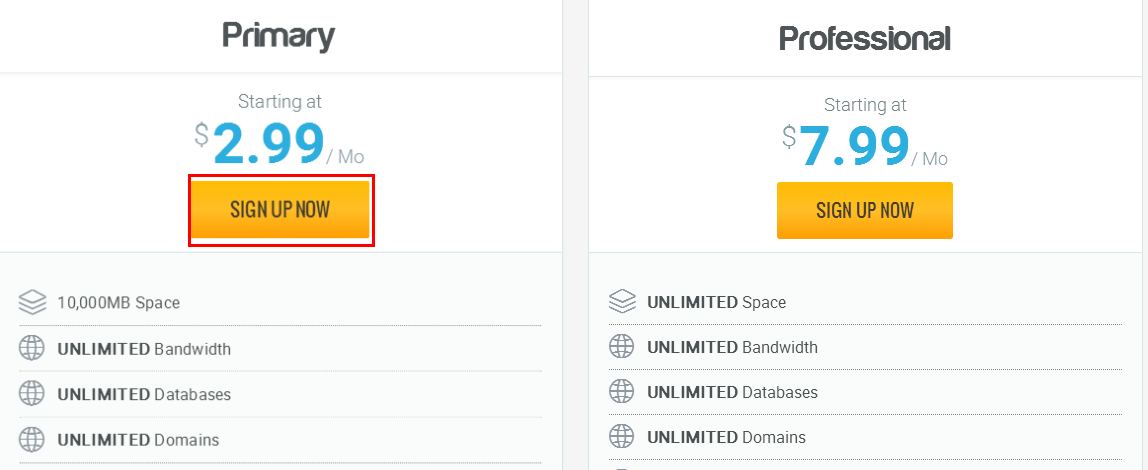 2、我们可以根据自己需要购买的商品,点击进入到购买页面。站长这里以Shared虚拟主机为例,点击”Shared“进入到共享主机页面,我们可以根据自己的情况购买相应套餐。这里站长选择的是”Primary“套餐,10G硬盘,无限流量。