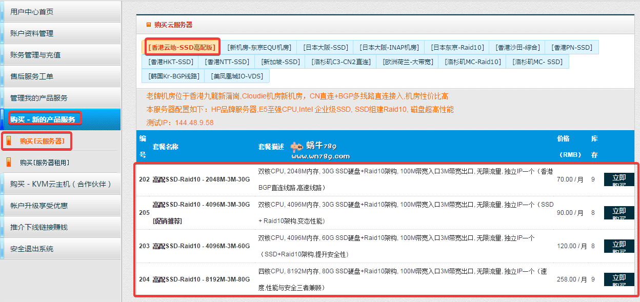 如何购买自己心仪方案?点击上面的直达链接到官网注册一个账号并登陆用户管理页面,然后如下图选择对应机房对应配置机器即可。