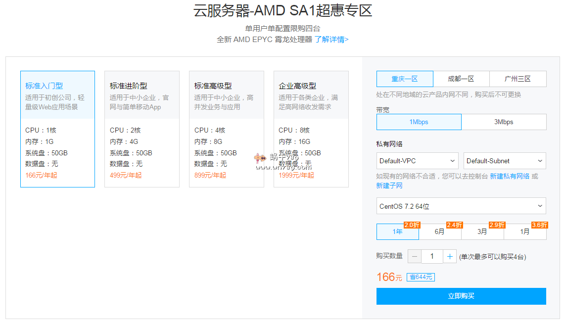 | 标准入门型1核1G | 重庆一区/成都一区/广州三区 | 1Mbps/3Mbps | 166元/年起 | 点击购买 |