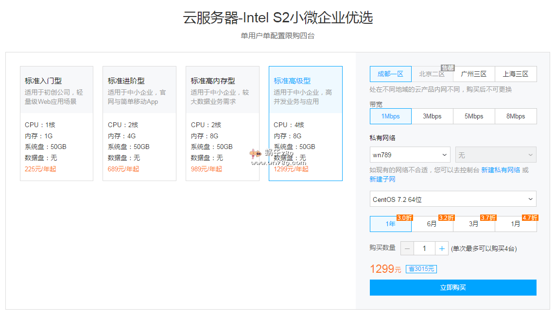 | 标准高级型4核8G | 重庆一/成都一/广州三/上海三 | 1Mbps/3Mbps/5Mbps/8Mbps | 1299元/年起 | 点击购买 |
