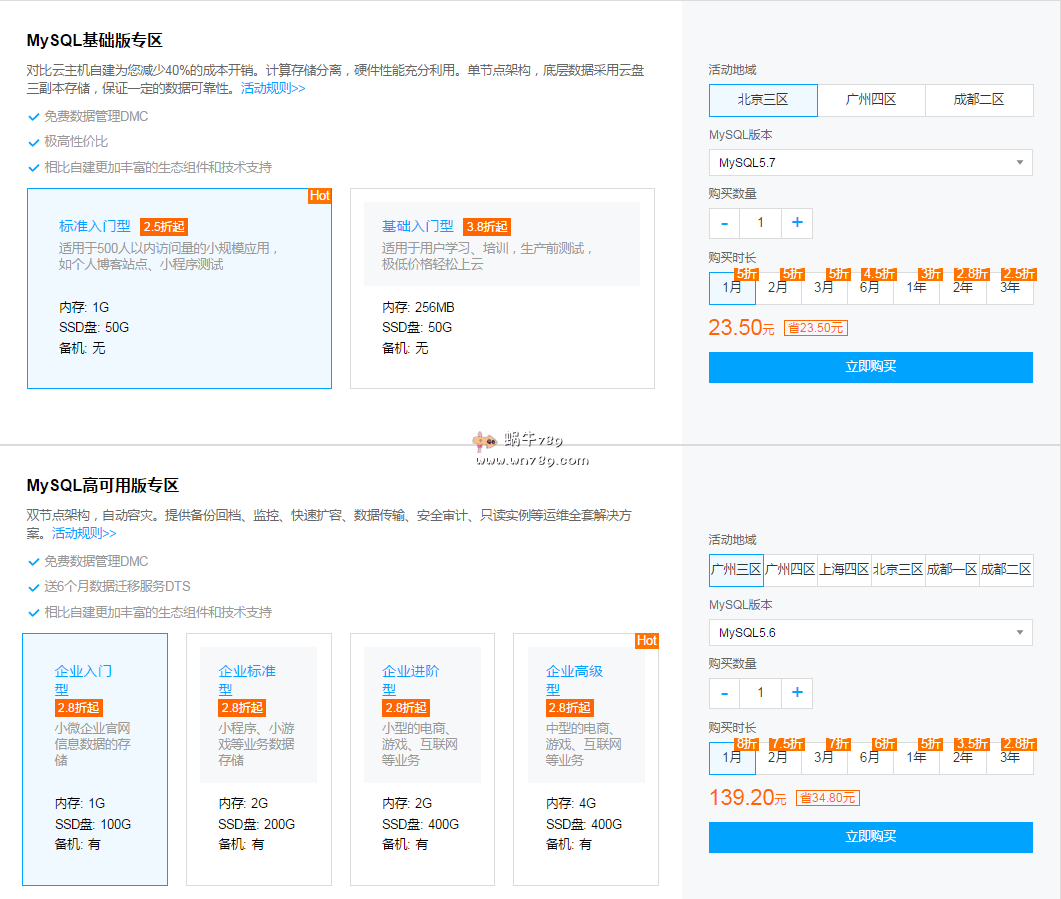 新老用户特惠专区产品分为“MySQL基础版专区、MySQL高可用版专区”两类,其中价格最为实惠的是MySQL基础版专区标准入门型方案:MySQL.5.7,1G内存50G SSD硬盘、2.5折优惠,三年仅需423元。活动期间所有MySQL基础版专区、MySQL高可用版专区产品单个用户单个配置限购20台,基础版机型暂不支持安全组、备份、回档、只读实例和灾备实例、数据迁移与升级到高可用版。如果是个人博客估计MySQL基础版专区标准入门型方案已经足够使用。另外腾讯云云数据库产品与云服务器产品可以通过内网互联,但选购时云数据库必须和云服务器在同一区域、同一网络。
