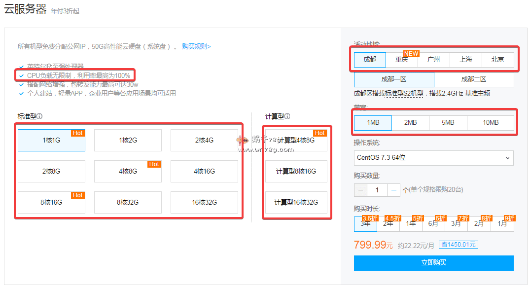 腾讯云“云服务器年付3折起”促销活动参与用户广泛,腾讯云官网注册并完成实名认证的新老用户均可参与购买促销云服务器产品,并且同一个配置最多可以以促销的价格购买20台(仅8核16G、8核32G、16核32G、计算型8核16G、计算型16核32G限购5台)。另外所有促销云服务器方案默认分配一个免费分配公网IP、50G高性能云硬盘(系统盘)、CPU(英特尔Ⓡ至强处理器)负载无限制,利用率最高为100%;适合个人建站、轻量APP、企业用户等各应用。下图是所有促销云服务器配置、节点、带宽、价格信息。