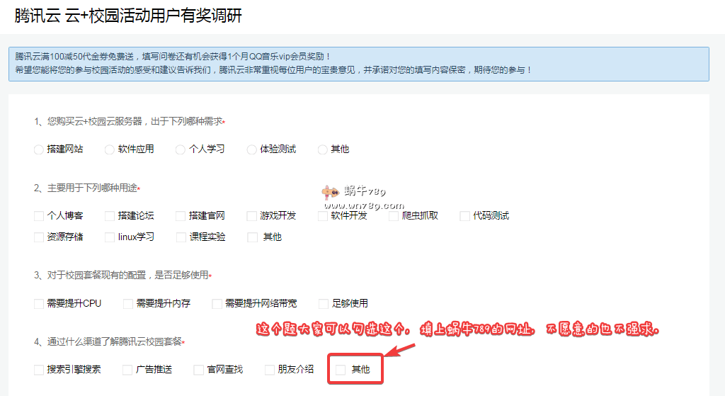 腾讯云是腾讯集团旗下云计算服务品牌,大企业,产品稳定靠谱,因为经常发布给力、无套路的促销获得,网友习惯称之为“良心云”。目前腾讯云针对学生认证用户有”云+校园活动用户有奖调研”活动,参与即可获得一张满100减50代金券,另外还有机会获得1个月QQ音乐VIP会员,有兴趣的朋友上车试试吧,据说是限量的调查,先上车先得。