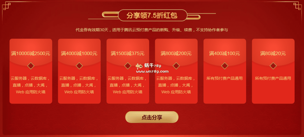 下图活动目前已经可以参与,点击分享按钮通过手机分享活动即可免费获得6张不同面值的7.5折代金券,可以用于腾讯云预付费产品的新购、升级、续费。