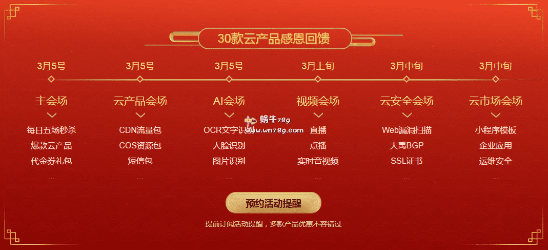 从3月5日开始每天9:00、11:00、14:00、16:00、19:00五场秒杀活动,主打云服务器、云数据库方案,这个还是比较有看头的。腾讯云促销活动一般新老用户均可参与活动,有云服务器、云数据库产品的大家可以重点关注。2折的秒杀力度相信大家都可以得到真正的优惠。