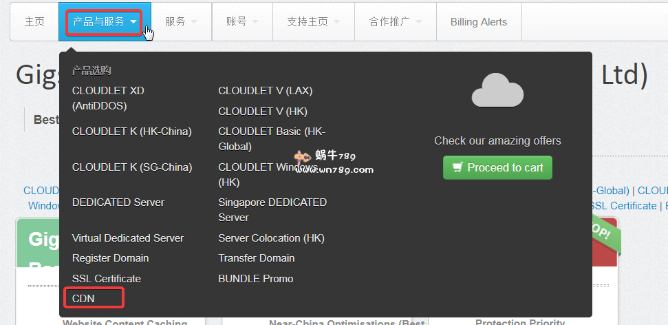 点击上面的购买地址进入到客户管理页面,安装下图红框位置点击进入到CDN购买页面。如果需要更多方案可以点击这里查看GigsGigsCloud CDN服务特用网站:www.gigsgigscdn.com。