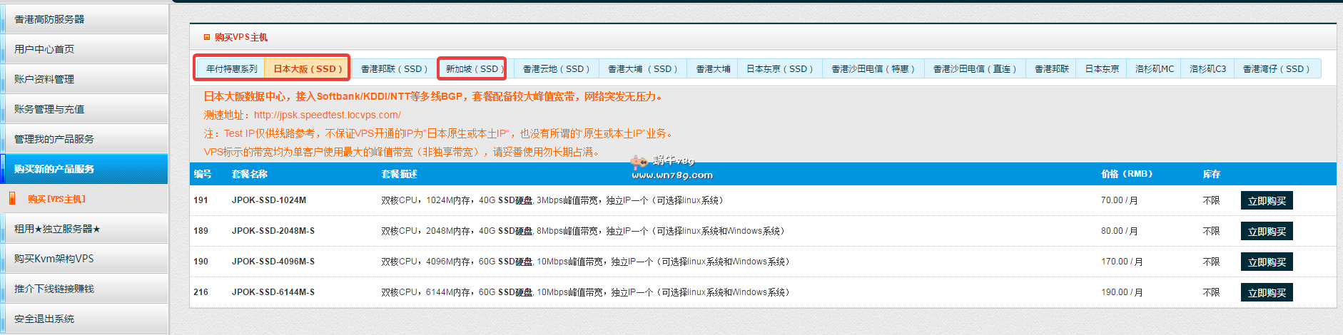 下面列举的是日本大阪SSD产品,机房接入Softbank/KDDI/NTT等多线BGP,国内优先软银线路直连,低延迟。分配的带宽为峰值带宽,不能长时间占用。另外下面还包含了年付特价方案,特价方案的CPU是单核虚拟双核vCPU。1G内存方案仅支持Linux系统,其他方案支持Linux及Windows。