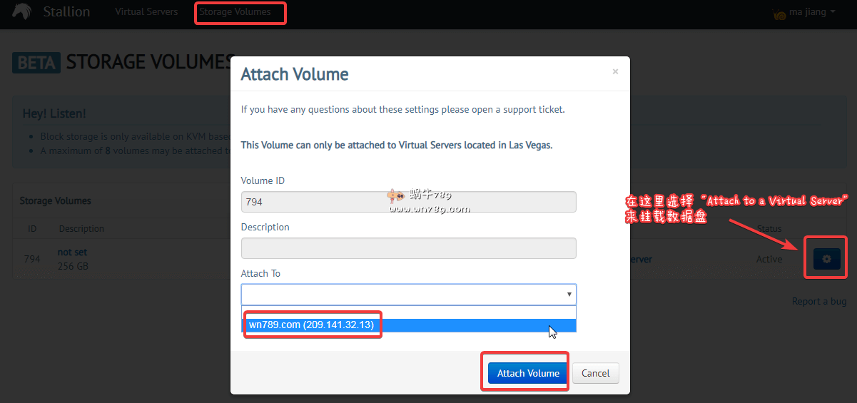 关于BuyVM拉斯维加斯KVM VPS“Block Storage”云存储盘挂载教程,挂载很简单,我们通过VPS管理面板可以非常简便的挂载Block Storage”云存储数据盘到指定VPS。如下图。另外如何把数据盘挂载到VPS指定目录,参加可以参考此文章:如何为Linux系统VPS挂载数据盘到指定目录。