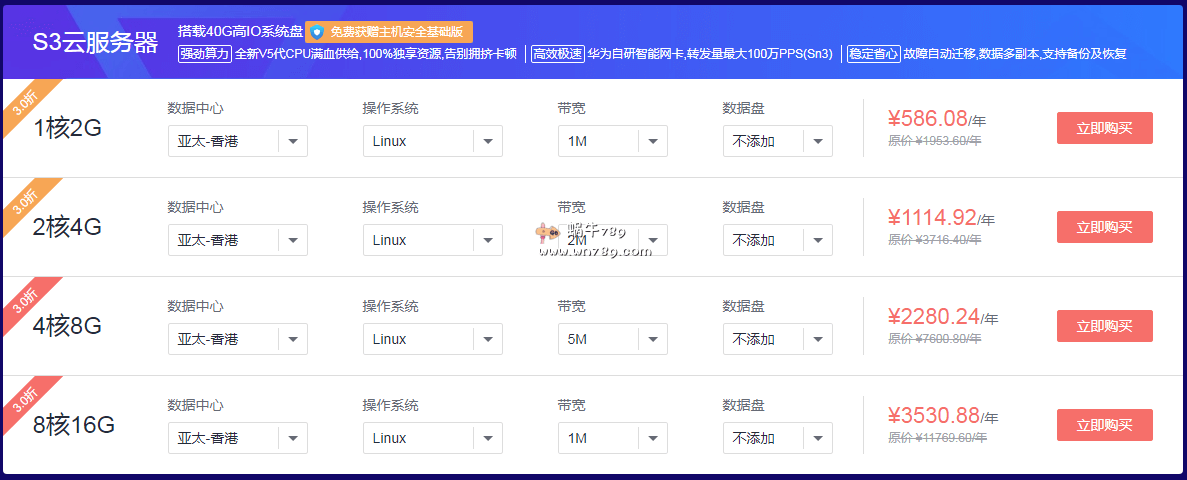 华为云除了学生特惠活动外,2019年4月2日-2019年5月31日还有一个云产品特惠活动,主打的也是云服务器产品,精选适合大众用户的方案,云服务器低至3折起,并且有中国香港节点可以选择,对于绝对稳定建站麻烦的朋友,香港数据中心绝对是稳定建站的最佳数据中心,无论是速度、带宽稳定性、搜索引擎SEO都远远要强于其他海外节点。如果的业务正当需要香港数据中心的服务器、VPS,那么可以重点关注下华为云的云产品特惠活动。