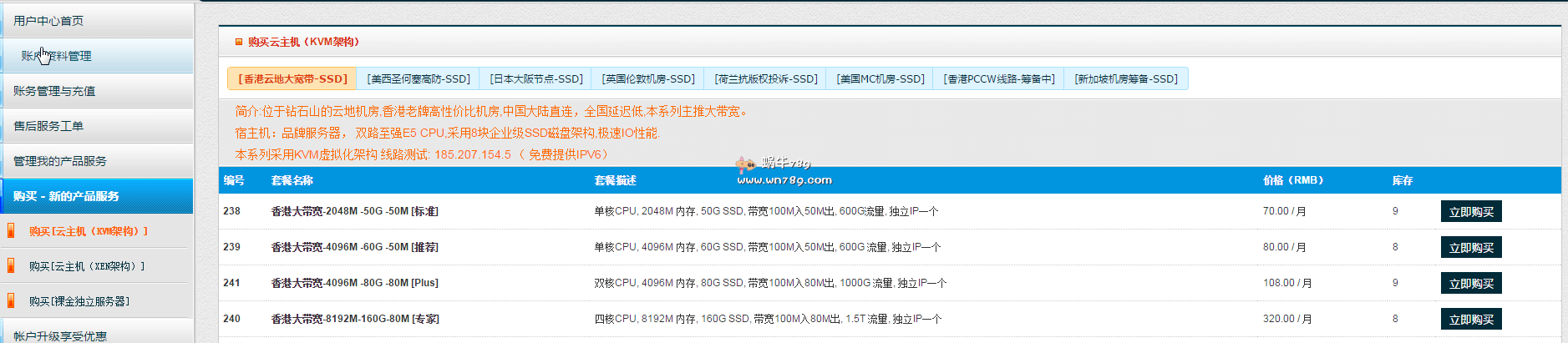 点击上面的注册地址注册一个账号,然后如下图选择“购买”-KVM架构产品既可看到香港云地大带宽SSD产品。傲游主机推出的KVM架构产品还是挺不错的,适合需要大带宽端口的用户,目前有香港云地、美国圣何塞、日本大阪、伦敦、荷兰抗投诉、美国洛杉矶等数据中心可以选择。