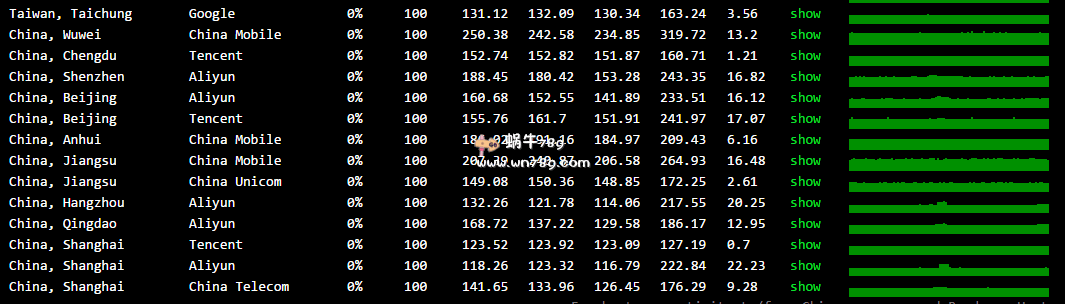 5、看看国内节点ping测试结果。一共110个节点有效,平均延迟156.3毫秒已经非常优秀了,主要是电信线路比较给力。