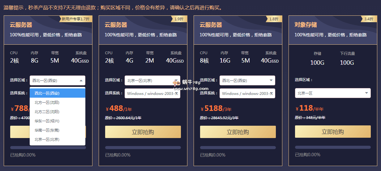 此次新睿云新春采购季活动为期33天,从2019年5月29日开始到6月30日结束,其中国内云服务器产品每日五场限时限量秒杀,分别为每天0点、9点、14点、18点、21点开抢,有国内较大带宽云服务器需求、建站需求、企业用途需求的同学可以关注下。秒杀活动主打国内云服务器产品,有西安、沈阳、绍兴、东莞、北京等节点可以选择,云服务器100%性能可以使用,支持Windows、Linux系统。