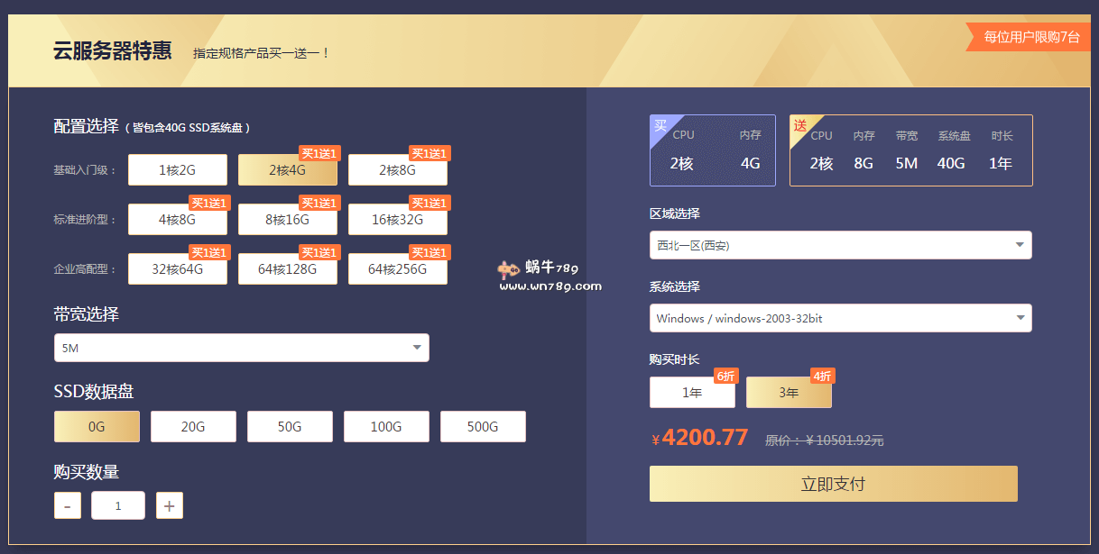 除了上面秒杀活动,还有云服务器买一送一活动,购买2核4G内存及以上的云服务器一年即可享受赠送活动。