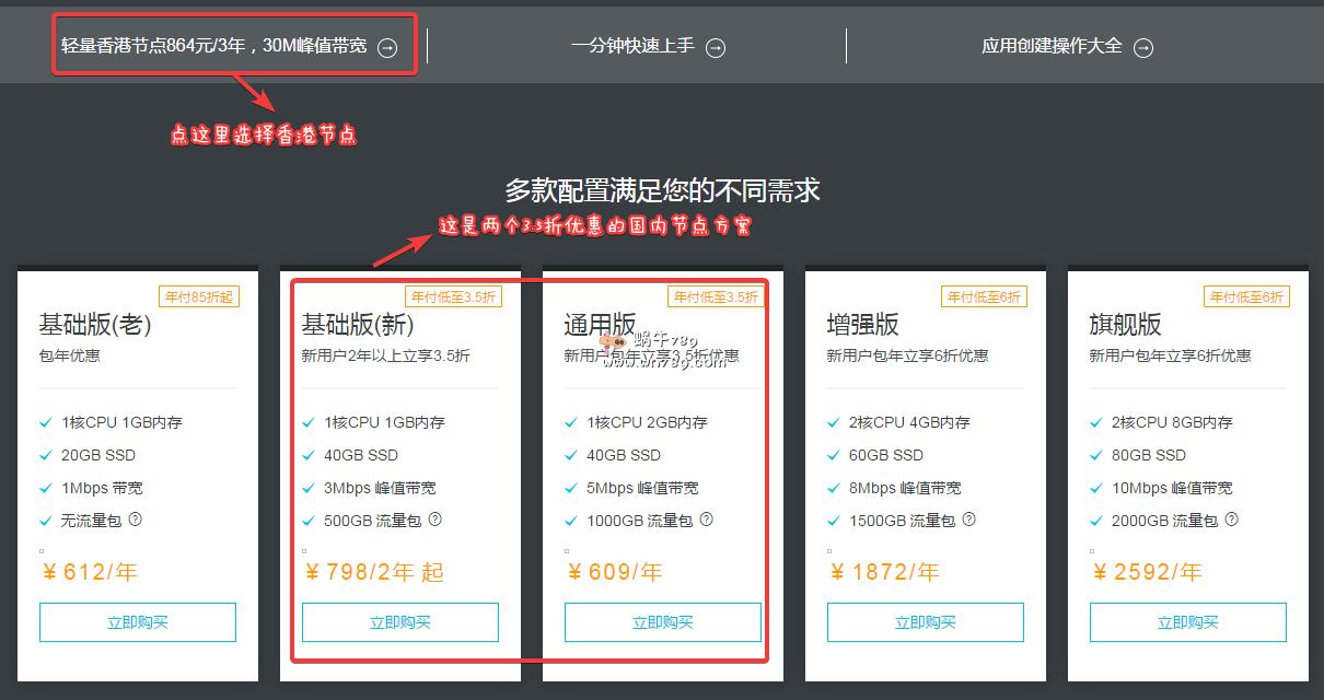 下面列举的是三款促销方案,所有方案对于一般的博客用户来说是完全足够了的。香港节点国内访问速度还是不错的,联通、移动往返直连,电信绕日,总体还算不错,稳定建站是绰绰有余,至于阿里云香港节点轻量应用服务器到国内速度怎么样,可以参考:阿里云轻量应用服务器香港节点补货/1核1GB/25GB SSD硬盘/30Mbps峰值带宽/1TB月流量/KVM/288元/年(附测评)。对于国内节点来说,此次优惠力度还是非常大的,不过只限新用户参与活动,低至3.5折的优惠。