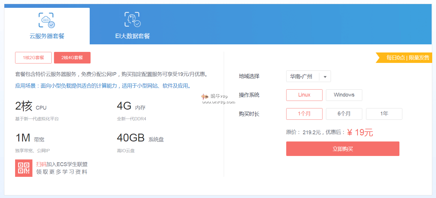 华为云“云创校园计划”的学生专享云服务器主打的是国内广州节点,并且相对国内其他主流商家来说,华为云学生机在配置方面是占优势的,有1核2G、2核4G内存方案可以选择,搭配1Mbps带宽,40GB高IO系统盘,支持Windows、Linux系统,2核4G内存配置年付只需199元,最多可以续费三次,也就是最多可以以超低的价格使用四年,如果是用于发展自己的小博客,估计2核4G内存配置完全可以满足你使用4年的需求了。