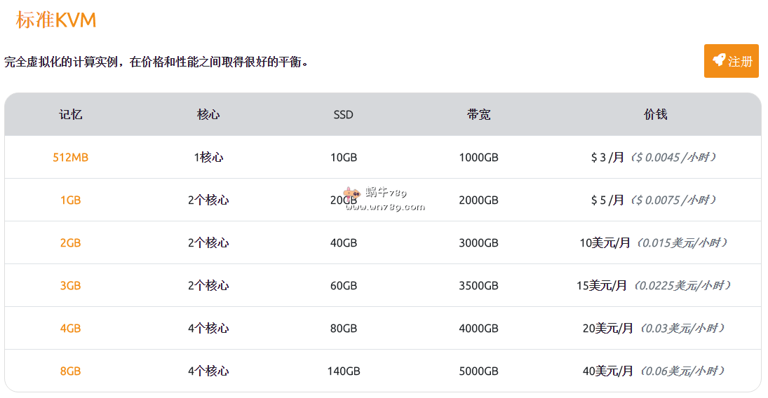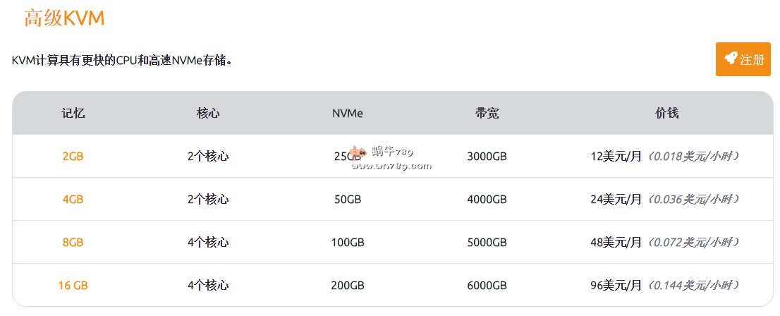 下面两个图片展示的是标准KVM和高级KVM全部云服务器方案、配置及价格大家可以根据自己业务需要进行选择,标准KVM是SSD硬盘,高级KVM是NVMe硬盘。另外大家还可以根据自身需要选择DDoS过滤的IP价格为3美元/月,点击这里订购高防IP这里;如果流量不够用,超过默认流量收费为0.004美元/GB。存储空间(快照,ISO上传等)收费为0.05美元/GB/月。