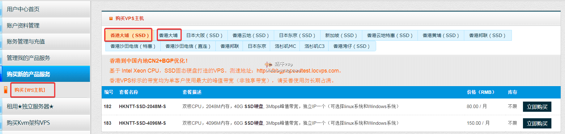 香港大浦SSD VPS、香港大埔HDD VPS两者在机房、线路方面均为一致的,唯一的区别是硬盘不通,相对来说HDD便宜一点,但是SSD读写效果更好,这个大家根据自己感觉选择即可,价格相差也不大,硬盘大小、配置、带宽均为也是一致的。除了下面整理的产品之外,此商家还有日本大阪VPS(SSD)、香港云地VPS(SSD)、日本东京VPS(SSD)、新加坡VPS(SSD)、香港云地特惠VPS(SSD)、香港黄埔VPS(SSD)、香港邦联VPS(SSD)、香港沙田电信VPS(特惠)、香港沙田电信VPS(直连)、香港邦联VPS、日本东京VPS、洛杉矶MC机房VPS、洛杉矶C3机房VPS、香港湾仔VPS(SSD)可以选择。