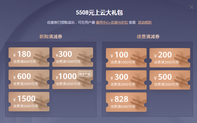 - 续费/升级代金券仅限于用户续费、升级场景使用,仅限于包月、包年计费类型,订单时长仅限1年以内,限用于华北-北京一、华东-上海二、华南-广州、亚太-香港、西南-贵阳一、华北-北京四。