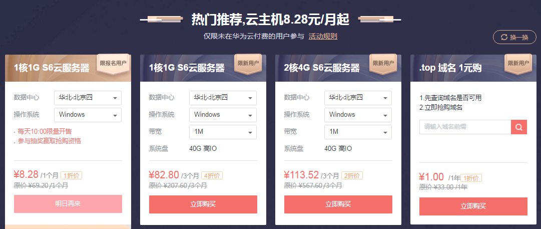 华为云,国内手机行业巨头华为公司旗下的云计算服务品牌,是国内知名企业,云计算服务行业的佼佼者,旗下云服务器产品自然是稳定可靠的,适合企业运行商业化项目。华为云此次推出了“企业上云节”活动,2019年8月21日-9月6日,可以以超低价格购买到高性价比的云服务器产品。如果对华为云服务器产品感兴趣可以关注下下面详细介绍。