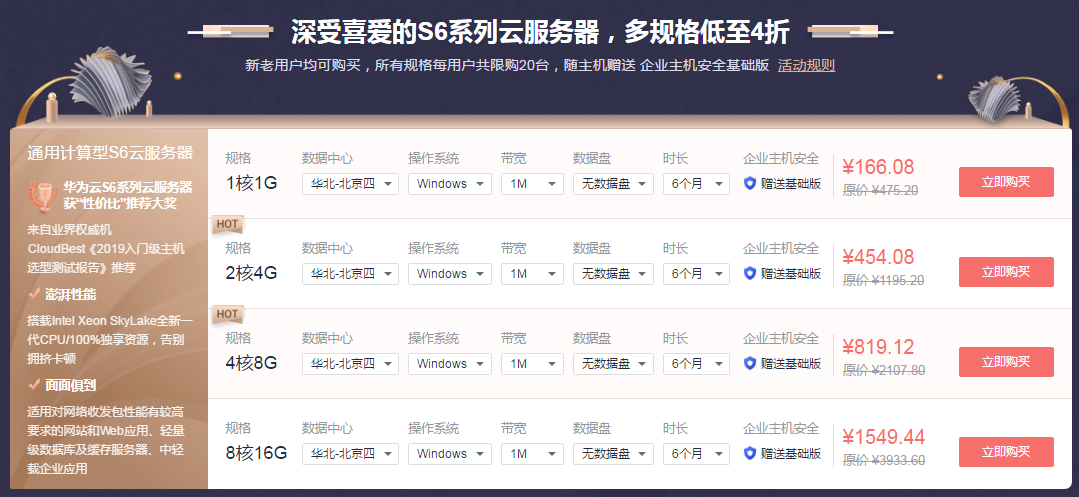下面是参与促销的四款S6系列云服务器产品,低至4折,有1核1G、2核4G、4核8G、8核16G四款配置可以选择,可以搭配1Mbps、2Mbps、5Mbps、10Mbps带宽端口。默认分配40G高IO系统盘,数据盘可以根据自己业务需求选择100GB、200GB、500GB。购买年限有6月、1年、2年、3年四个周期。如果有对应需求的,价格还是非常实惠的。可以自由选择数据盘,这也是华为云的一大特色,如果对硬盘需求比较大是比较不错的。