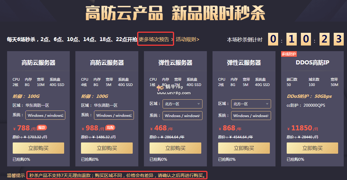 新睿云此次推出的秒杀活动时间为2019.8.15-2019.11.15,每天6场秒杀,时间分别为06:00-10:00、10:00-14:00、14:00-18:00、18:00-22:00、22:00-02:00、02:00-06:00。高防产品新老用户皆可参与,云服务器、GPU服务器仅限于新用户,每次秒杀每款配置限抢购1台。