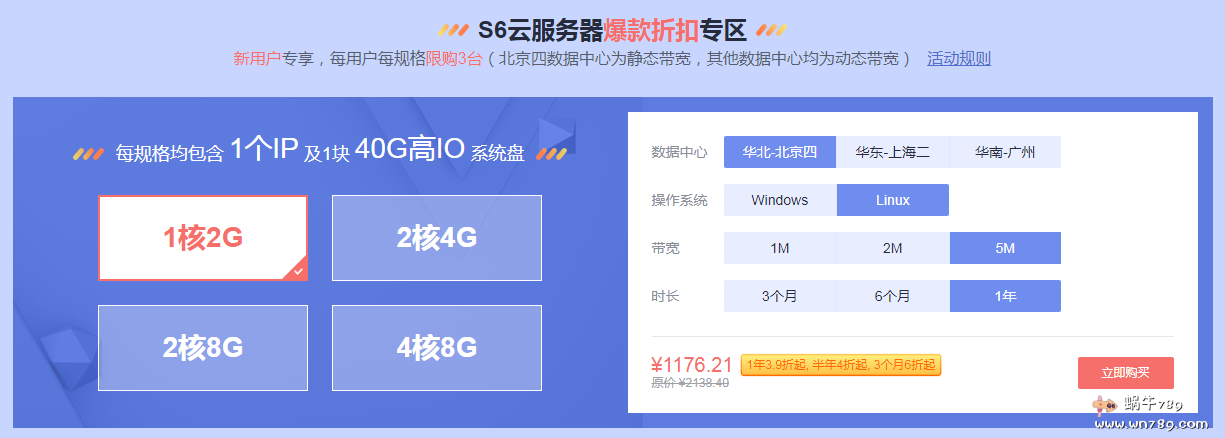 爆款折扣专区云服务器产品仅有国内节点可以选择,也只适合新用户购买,每个方案最高可以购入3台,产品优势是可以自由搭配大带宽,适合对带宽端口有妖气的用户。如果对公网ip的线路有要求,请注意华北-北京四数据中心为静态BGP带宽,华东-上海二和华南-广州均为动态BGP带宽。