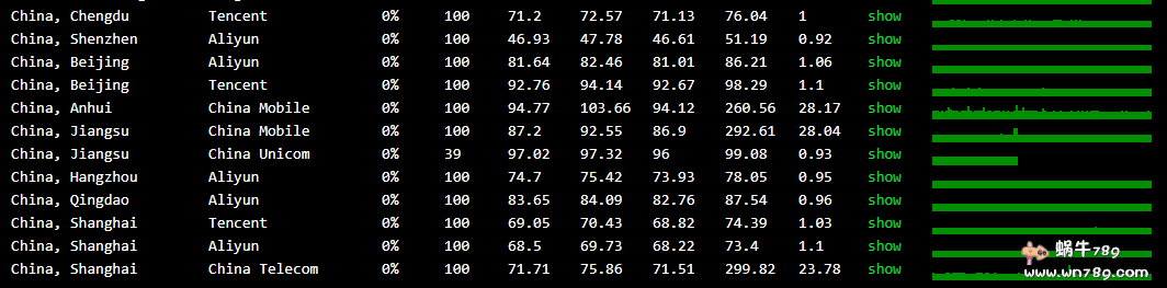 | 联通线路 | 11 | 广东茂名(联通) 52.7 毫秒 | 江苏徐州(联通) 104.4 毫秒 | 85.9 毫秒 |